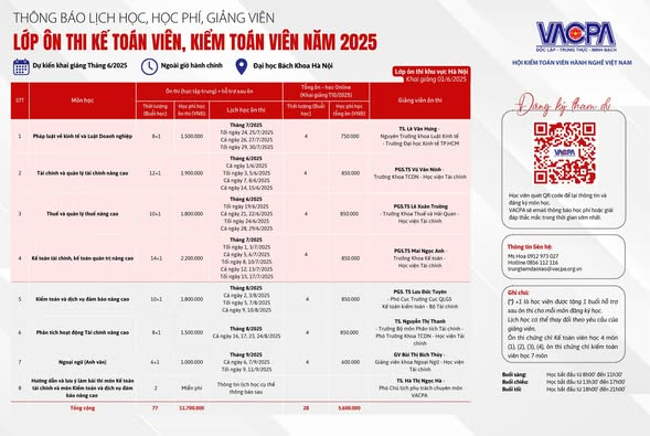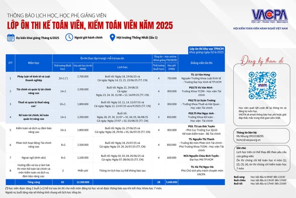 VACPA Thông báo lịch học, học phí, giảng viên của các lớp ôn thi chứng chỉ Kiểm toán viên, Kế toán viên năm 2025